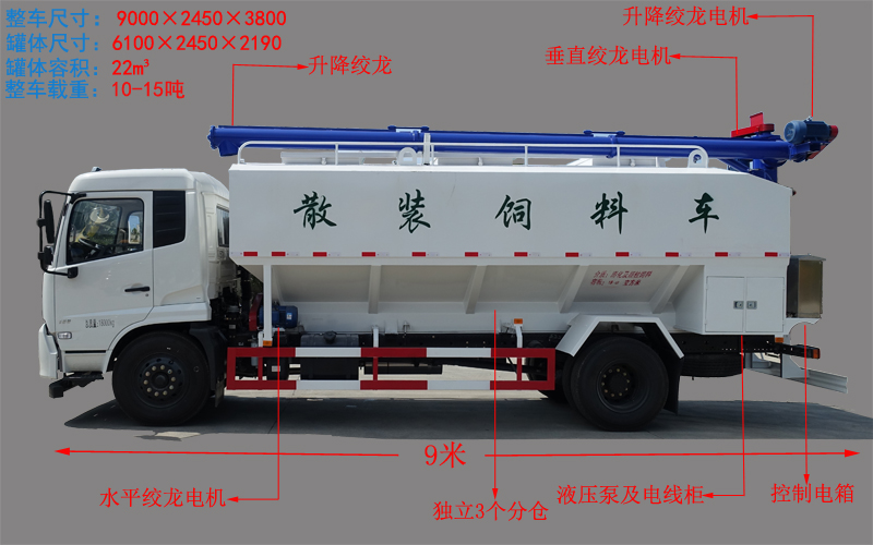 液壓式散裝飼料車的飼料罐架設在卡車的底盤上,專用設施由罐體總成、輸送系統(水平卸料系統、垂直卸料系統以及活動卸料系統組成)、液壓系統(高壓油泵經管路與分配閥連接該閥的三個輸出端分別是轉角液壓馬達、升降油缸以及串聯在一起的水平卸料、垂直卸料、活動卸料液壓馬達)、電動系統、氣動分倉機構等組成。在罐體底部設有閘門,在閘門下面裝有水平螺旋輸送器(俗稱水平攪籠),由取力器由汽車變速箱輸出動力驅動,再傳動高壓油泵以驅動液壓系統,液壓馬達通過傳動裝置帶動水平螺旋輸送器的葉片軸及葉片旋轉, 經活動輸送系統(俗稱活動攪籠)以將飼料輸出。車頂平置的一根活動卸料絞龍可自由回轉和抬升,運輸時,頂部的螺旋管平臥在罐頂;卸料時則抬起,使管端的出料口與畜禽飼養場貯料罐頂部的進料門相接、對準,完成卸料。電動絞龍散裝飼料運輸車是針對不同客戶群最新研發的、滿足低端市場的新產品,該車不配車載發電機,電動絞龍利用市電三相380V來供電,車輪距較小能適應農村鄉間道路。該車性價比高很受客戶的青睞,適用于路況狹小的小型養殖場、飼料廠。采用機械螺旋的卸料方式,卸料速度快,可連續作業,大大提高生產效率。罐體可分隔成二至四倉,同時裝載不同飼料;各部件結構簡單,操作方便靈活,易于維修保養。