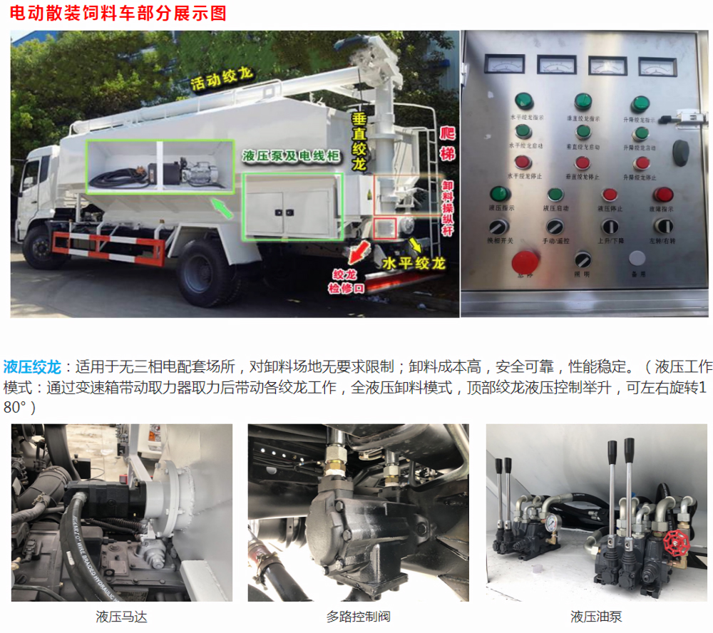 轉(zhuǎn),聯(lián)鎖保護(hù)等功能。無(wú)三相電場(chǎng)所可加裝車(chē)載發(fā)電機(jī)供電。卸料可選裝無(wú)線遙控操作。】第二種:液壓馬達(dá)卸