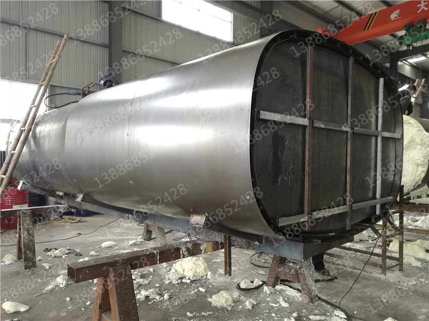 另一種則是聚氨脂材料發泡保溫。聚氨脂泡沫材料的填充是利用專門的發泡機械將化學生成的發泡體噴吐至罐體與骨架之間。噴吐時慢慢的堆積成型,這樣使泡沫材料更加嚴實。對于多余的或高于骨架外型表面的發泡體,利用鏟刀將其打磨。外表蒙上一層0.8mm厚的冷軋板,采用抽芯鉚釘將冷軋板固定在骨架上。