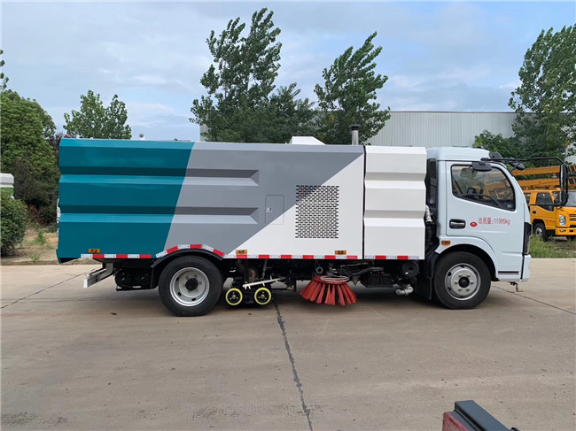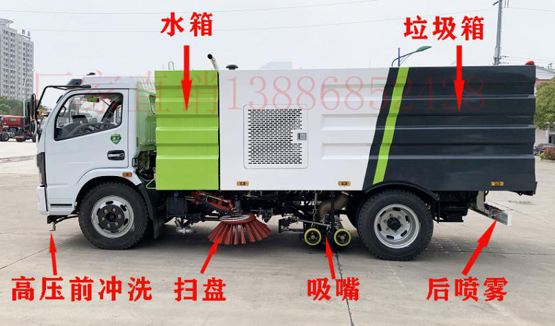 該洗掃車采用東風(fēng)多利卡國(guó)六二類底盤改裝,加裝副發(fā)動(dòng)機(jī)、風(fēng)機(jī)、清水箱、垃圾箱、左右立掃、掃盤降塵系統(tǒng)、左右高壓側(cè)噴高、吸盤內(nèi)置高壓主噴桿、氣動(dòng)系統(tǒng)、液壓系統(tǒng)、專用裝置電控系統(tǒng)和副車架等改裝而成。