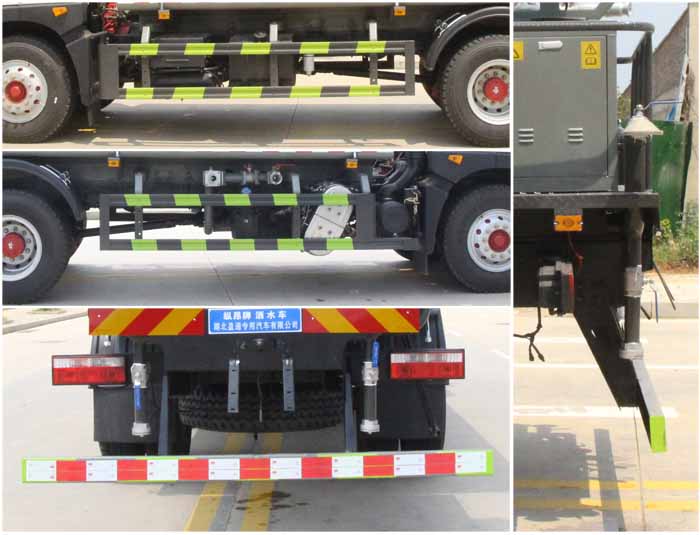 該車主要用于城鄉(xiāng)園林綠化噴灑作業(yè);主要裝置為水罐及噴灑裝置;罐體總?cè)萘?/span>:10.7立方米;罐體有效容積:10.2立方米;罐體外形尺寸(長×長軸×短軸)(mm):4800×2300×1300.ABS系統(tǒng)生產(chǎn)廠家,型號(hào):焦作博瑞克控制技術(shù)有限公司,J ABS;襄陽東風(fēng)隆誠機(jī)械有限責(zé)任公司,ABS/ASR-24V-4S/4M.側(cè)、后防護(hù)材料均為:Q235碳鋼,連接方式均為:螺栓連接,后部防護(hù)截面尺寸(mm):120×50,后部防護(hù)離地高度(mm):480.隨底盤選裝限速裝置,限速89km/h.隨底盤選裝燃油箱,電瓶,尿素罐,儲(chǔ)氣筒左右安裝位置,選裝噴霧裝置樣式.選裝箭頭燈裝置,選裝前部電子水炮裝置樣式,選裝前部不帶電子水炮;當(dāng)前部帶電子水炮時(shí),前伸500mm,整車長度為9100mm,8550mm;當(dāng)前部不帶電子水炮時(shí),前伸為0mm,整車長度為8600mm,8050mm.選裝罐體頂部高位花灑裝置及方形罐口,選裝尾部自流口裝置,選裝工具箱.采用底盤4500mm軸距改裝.后軸僅采用鋼板彈簧懸架. |