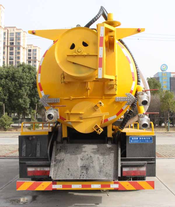 該車用于下水道排污及疏通,專用裝置:罐體、吸污泵、清洗沖刷總成.該車輛具有舉升功能,罐體外形尺寸(罐體總長×直徑)(mm):4900×1750(前面1600mm為清水罐,后部3300mm為污水罐);污水罐總容量:6.91立方米,污水罐有效容積:6.58立方米,介質:液態污物,密度800千克/立方米;清水罐有效容積:3.6立方米,介質:,密度1000千克/立方米;清水罐和污水罐為獨立罐體,清洗功能時用清水罐,吸污功能時用污水罐,污水罐和清水罐不可同時滿載,兩罐不可同時使用.ABS型號/廠家:ABS型號:ABS/ASR-24V-4S/4M,廠家:襄陽東風隆誠機械有限責任公司;側、后防護材料均為:Q235碳鋼,側、后防護均為螺栓連接,后部防護截面尺寸(mm):120×50,后部防護離地高度(mm):380;僅采用底盤3800mm軸距改裝.隨底盤選裝駕駛室,選裝油箱位置.選裝后部出口樣式,選裝側面樣式.隨底盤選裝車速89km/h.
